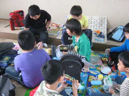 1組・2組まざりあって仲良くお弁当を食べているところです。実は,今日は3年生が大文字山に遠足に行く日だったのです。朝から曇ってはいたものの,みんな遠足に行く気満々で登校していました。しかしながら,大気の不安定・京都市に雷注意報発令・降水確率の予報などなどの情報により延期の判断をしました。