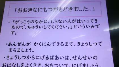 「不審者」が侵入した場合、どのように避難するのか避難訓練を行いました。1年生は、事前に一人で留守番するときに、気を付けることも学びました。「おおきなにもつがとどきました。」という放送は学校に不審者が侵入した合図だよと教えてもらってる様子は真剣で、まじめに避難する様子に感心しました。