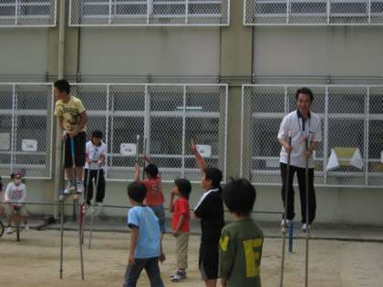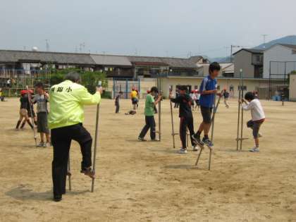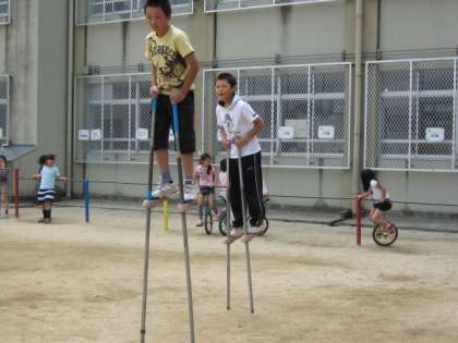 中間休みの様子です。竹馬(竹馬のようですが、鉄でできているので、子どもたちは鉄馬と呼んだりもしています)を6年生が楽しそうにしていました。高い竹馬に乗っている子もいて,すごいなあと見ていると、校長先生も挑戦されていました!それを見て、また他の学年の子が「私もやりたいな・・」とつぶやいていました。「昔取った・・・」と子どもと一緒に竹馬に乗っている先生も出現して・・。それを見て、他にも「一緒にやろうかな」という先生の声も何人か聞いています。子どもたちもきっと喜ぶでしょう。これから、ますますブームになりそうです。