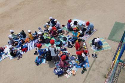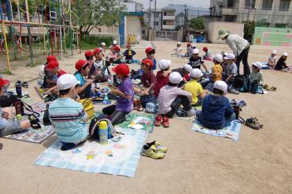 1年生と同様に動物園に行けなかった2年生は運動場で弁当を食べました。