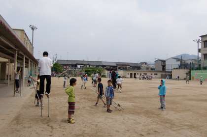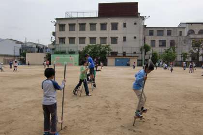 10日,今日も6年生が竹馬に乗っています。