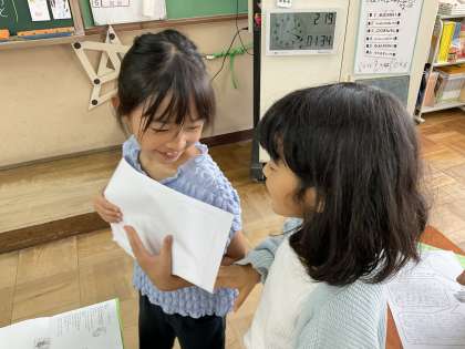 まずは自分一人で考え、その後ペアで交流しました。交流をして「なるほど…」と友だちの考えに納得する姿や「同じだね!」と嬉しそうな姿が見られました。
