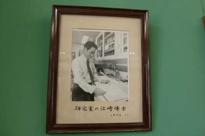 四錦の理科室には大先輩の江崎玲於奈博士の写真が掲げられています。まだ,お若いころの写真で,おそらく研究に没頭されていた当時の研究室で撮影されたもののようです。