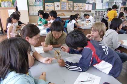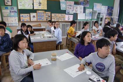 食塩水に種もみを入れて,その中を沈んでいく重い種もみを探している5年生です。