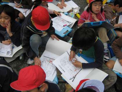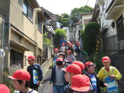 今日は「校区探検」で,学校の東側を歩きました。