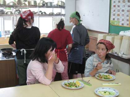 その中でも,野菜があまり得意ではない子どももいましたが,どうすれば食べられるか試行錯誤し,その結果野菜のみじん切りをあみだしていました。味付けは,塩コショウぐらいですが,自分たちが一生懸命作ったので,日頃の給食なら悪戦苦闘していましたが,見事完食していました。「この方法なら,いつでも食べられるのかも・・・。」