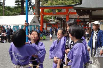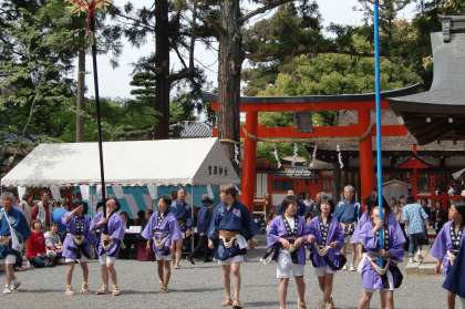 四錦の部活剣鉾と和太鼓の子どもたちが吉田神社の境内で,たくさんの人の前で『技』と『心意気』を披露する日です。