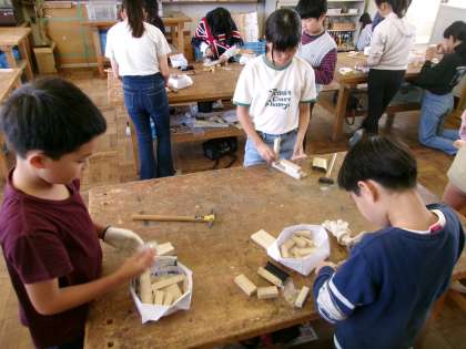 のこぎりを使って切った木切れを組み合わせて、クギで打って形を作っていきました。最初は不慣れだったのこぎりもどんどんと上達しました。どんな作品が出来上がったか、お楽しみに。