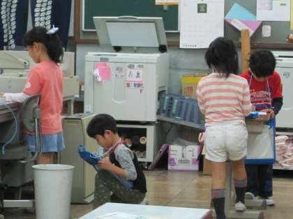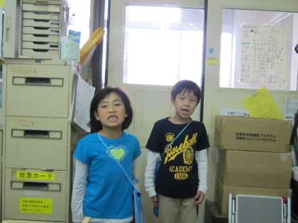 今日は、1年生だけで学校たんけん!職員室にもやって来ました。緊張しながら「失礼します。1年○組の○○です。」「学校たんけんに来ました。」とあいさつし、静かに職員室を見ていました。発見したものの中で、青い温度計が珍しかったのか、熱心に絵を描いている子どもたちもいました。