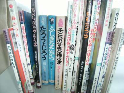 本校の図書館にある本ではありません。実は左京図書館から借りたものです。本校は,毎年,左京図書館と連携して,団体貸出の制度を利用させてもらっています。これらの本は,2年生が国語の発展教材として,昔話を希望し,それに合うものを,左京図書館の方がセレクトしてくれたものです。40冊を約1か月借りることができます。さらに,本好きになってほしいです。