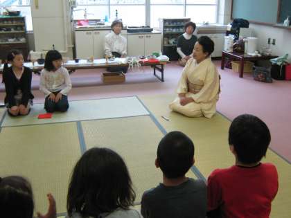 今日が初めての子達も,先生にお茶の点て方を教えてもらい.,ドキドキしながらお茶を点てていました。