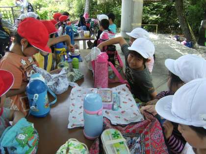 午前中の活動を終えて,いよいよお弁当です。幸いに屋根のある所が確保できたので,汗ばむような天気でしたが,涼しい風が吹く中でお弁当を食べることができました。お弁当を用意するときは本当に笑顔になりますね。