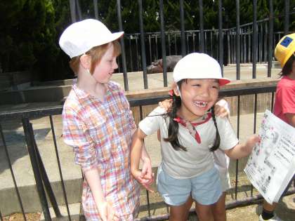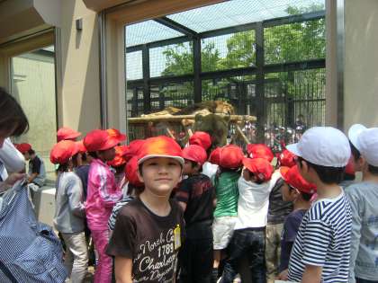 「もうじゅうワールド」という新しい場所がオープンして間もないので,そこはすごい人気でした。ガラス越しにライオンの顔を間近に見ることができます。一番下の写真の真ん中辺にライオンの雌の顔が見えると思います。大きく見えることが分かっていただけるでしょうか。子どもたちは,それぞれのグループが,園内の地図を持ち,オリエンテーリング風に回った所にシールを貼って楽しみました。
