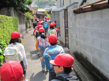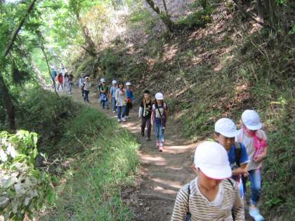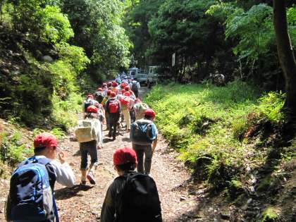 9:00に出発して銀閣寺の登り口につくと、市内のいろいろな学校の3年生がいました。きっと、四錦小は2番目に登り始めたと思いますが、市内の10校近くが登ったのではないでしょうか。こどもたちは、「山の空気やなぁ」「もう階段はいややぁ」と言いながらも、10:30頃には山頂に到着しました。