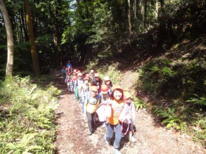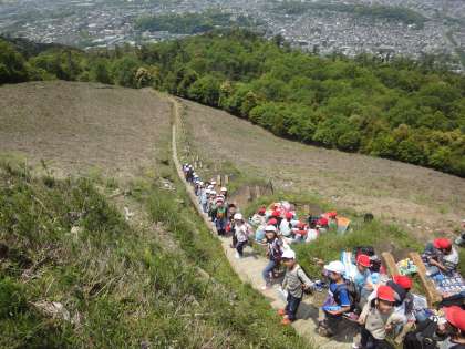 意気揚揚と出発した3年生でしたが,山にたどり着くまでに,1時間近く歩き,登り始めからお疲れモード…。