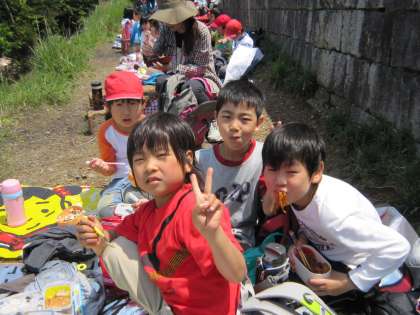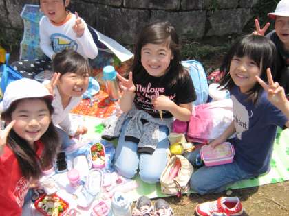 遠足とは不思議なもので、まだ10:40、中間休みが終わったぐらいの時間だというのにお腹がへってしまうのです。社会科の勉強もそこそこに、「いただきま〜す」。どの子もおいしそうに、お弁当タイム。その中におどろいたお弁当が…。かわいい顔のおにぎりやキティーちゃんやくまさんまで。ワンピースのノリの切り絵にいたっては、芸術的で、思わず「食べてはいけません」と言ってしまいました。