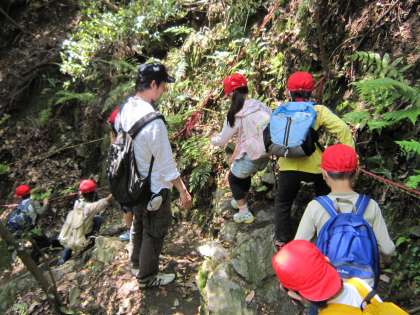 大文字山の下りは、「大」の字の3画目にそって下り始めます。右はらいの奥へ行くと、少し危険な個所が1っ個所あります。ロープを使って、ゆっくりゆっくりと下りました。ちょっとしたアドベンチャーです。「こんなん初めてや」と言っていた子どももいました。