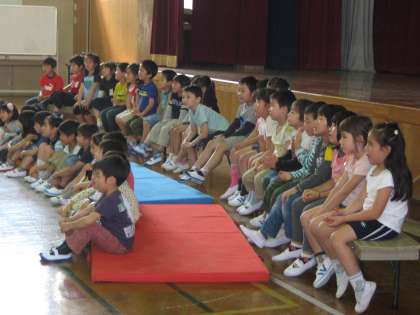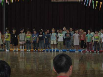 初めて全校児童の前で発表して,とても緊張したことと思います。でも,大きな声が後ろまでしっかり届き,歌も上手に歌えて,すばらしい発表になりました。1年生もよくがんばりました。