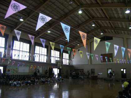 3年生以上の代表委員会が企画し作った旗が,会場の体育館に貼られ,雰囲気を盛り上げています。1年生がその中を6年生と手をつないで入場してきました。温かい拍手に迎えられて,いよいよ始まりです。6年生の代表委員が「はじめの言葉」を立派に言いました。