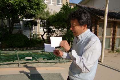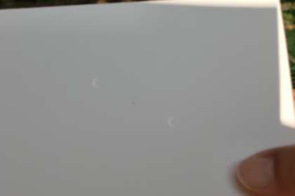 写真は『金環日食』まであと数分というころに撮ったものです。ピンホールシートで日食が見られるかどうかを確かめています。部分日食の形はくっきり見ることができました。見えるのは分かっていても,やっぱり驚きです。