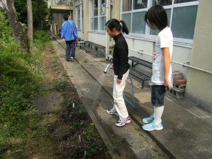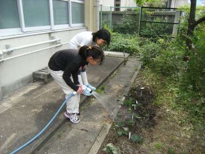 昨日,南校舎の南側に「オーシャンブルー」と「ハッピーブルー」を植えました。早速今日から,環境委員会の当番が水やりに来てくれました。今日は,朝から暖かでしたので,朝顔も水を待っていたようでした。