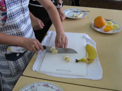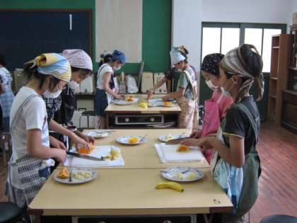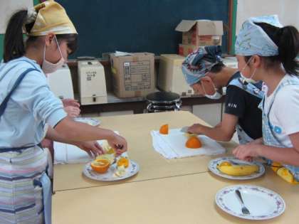 家庭科の学習で調理実習をしました。今回フルーツパーティーです。包丁とまな板の正しい使い方を学習しました。また、切り方や盛り付けを工夫して楽しいだんらんについて考えました。
