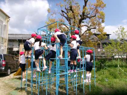 初めての体育の学習では、ジャングルジムとうんていの使い方を学びました。メガネの指で、しっかり棒をにぎること、飛び降りないこと、後ろに人がいないか気を付けてのぼることなど、しっかりと学習しました。ジャングルジムやうんていで、仲良く楽しく遊ぶことが