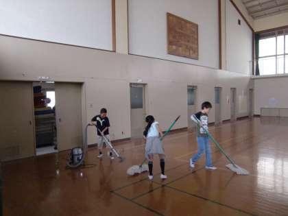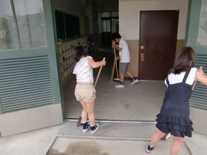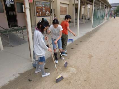 ほうきを持った子どもたちが北校舎の出入り口のところに集まり,躊躇なく足ふきマットを取り払い掃き掃除を始めました。そのよどみない動きと集中力が際立つ姿に,「この子たちは音楽が流れる前からもうすでにこの掃除場所付近にきていたに違いない」と思わされました。