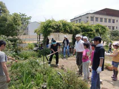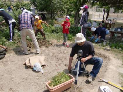 池の水を田んぼに引くための水路作りです。本格的に測量もして…