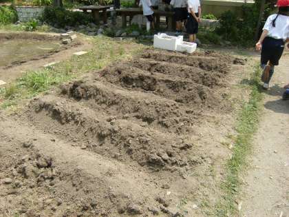 2年生がさつまいもを育てます。その苗を本校の地域の方からいただきました。ビオトープ横の畑に本日植えました。秋にたくさん収穫できるように,大切にお世話をしていきたいと思います。