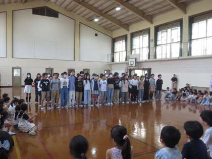 6年生は、学校のいいところや6年生のいいところをリズムにのせて伝えました。楽しい出し物で会場を盛り上げた後は『つばさをください』の合唱をしました。楽しくするところは思い切り楽しく、かっこよく見せるところは真剣に取り組む。そんな6年生の姿を見せることができました。