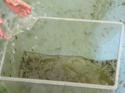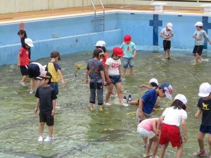 1年生は、プール掃除の前にプールにいる水生昆虫を探しました。水を抜いて浅くなったところには、たくさんのアメンボがいました。子どもたちが、必死になってアメンボを捕まえると、水槽いっぱいになりました。大きなヤゴもいくつか捕まえて、大興奮でした。また、「早くプールに入りたいよ。」とたくさんの子が言ってました。水の季節がやって来ましたね。