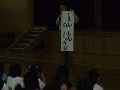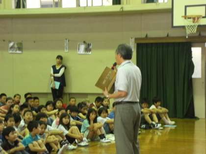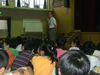まず,全員で「みんなのうた」の全校合唱をしました。その後,校長先生から本校の歴史についてのお話がありました。昭和六年六月六日に本校が創立された当時の人数などが紹介されました。
