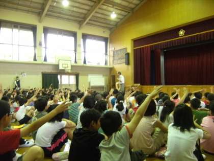 校長先生から,第四錦林小学校について,創立当時の全校人数,一番多い時の全校人数,本校の卒業生の総人数などについてクイズが出題されました。三択問題で,一年生から六年生まで,皆が頭をひねって考えていました。お家でも話題にしてほしいです。