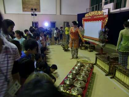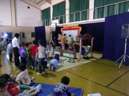 今日のビッグイベントは文化鑑賞。インドネシア伝統芸術団ハナジョスによるガムラン演奏やジャワ舞踊,そして,ワヤン・クリ(影絵芝居)です。