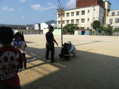 いつも持っている剣鉾より,次は少し重いものに挑戦しようとがんばって練習しています。また,剣鉾をさして歩けるようになった児童は,剣鉾を一から持ち上げる技術を習得しようと練習を積んでいます。この,腰を落として剣鉾を持ち上げることが,本当に難しいのです。6年生がとても良いお手本を見せてくれます。