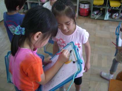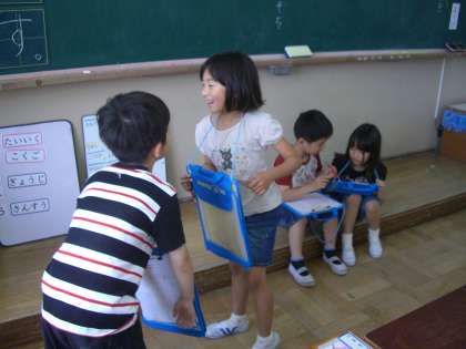 国語の「なぞなぞあそび」最後の時間です。今日は,新しく作ったなぞなぞを友達同士で出し合いました。いい問題だなと思った問題を友達に伝えました。なぞなぞ遊びが終わると,「友達からたくさんほめてもらったよ。」と話す子がたくさんいました。