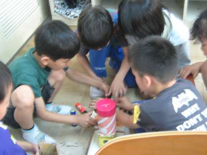 子ども達がお家から持ってきた,いろいろな形の空き箱や空き缶の特徴を考えて,グループごとに協力して何かを作っています。