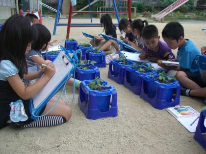 成長してきたあさがおです。数日前から,何人かの子どもたちが「ねこじゃらしみたいなのが,生えてきた!」と話していました。今日,みんなでよく見てみると,ほんとにねこじゃらしみたいな葉が!「さわってみるとちくちくするよ。」とまた新たな発見がありました。