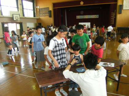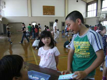 本校の外国語活動のスタートとして,全校で「オリジナルネームカード」を作りました。自分の名前の初めのアルファベットを設定されたコーナーにもらいに行きました。縦割りグループのにこにこグループが活動母体でした。1年生は,6年生や他の上級生に教えてもらったり手伝ってもらったりしながら,楽しく活動でしたようです。