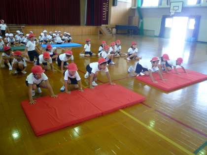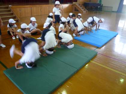 「ちゃんとできるかな?」と少し不安もありましたが,さすが2年生,みんな見事に前転をすることができました。