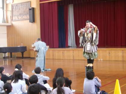 本日、茂山狂言会の方をお招きし、狂言についての特別授業を行いました。国語の授業で学習した『柿山伏』を、実際に目の前で鑑賞することができ、児童たちにとって非常に貴重な体験となりました。
