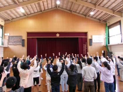 鑑賞だけでなく、狂言独特の歩き方や声の出し方、柿を食べる動作なども丁寧に教えていただき、児童たちは楽しみながら学ぶことができました。狂言を初めて知った児童も多く、興味を持って積極的に参加する姿が見られました。