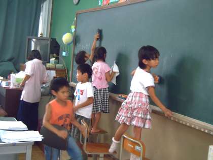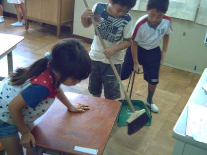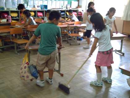 自分たちの教室と前の廊下のおそうじを,がんばってしています。6年生に掃除の仕方をやさしくていねいに教えてもらってきたおかげで,今ではほとんど1年生の力だけでおそうじができるようになりました。ほうきでごみを掃く仕事,つくえといすを運ぶ仕事,ぞうきんでつくえや窓などのふきそうじ・・・どれもお友だちと力を合わせてしています。