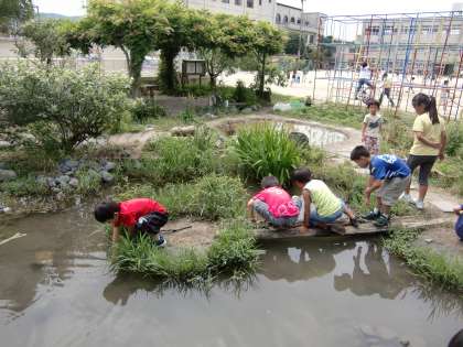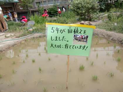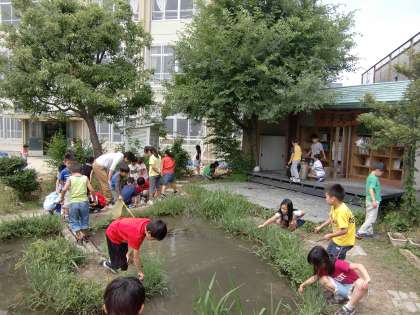 気温が上がってきて蒸し暑さが増してきました。「不快指数」がグングン高くなっていく中間休みのビオトープにはアメンボとりの1年生に交じってあのザリガニハンターが久しぶりに復活していました。