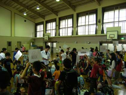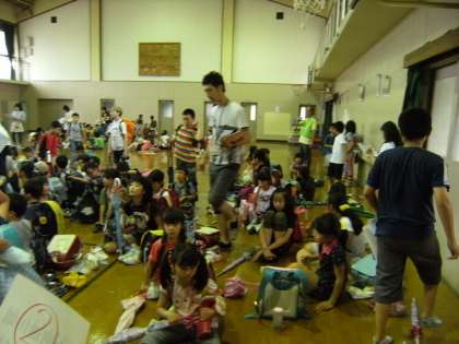 本日,台風4号の接近により暴風警報が発令されたので,集団下校となりました。全員が体育館に集まり,町別に集合しました。また,学校に待機する児童は,体育館の中の別の場所に集まりました。お迎えの保護者が早めに来てくださったので,全児童の避難が速やかに終わりました。神楽岡地域の児童も少し雨の強くなった中を,お迎えの保護者と一緒に集団で帰りました。