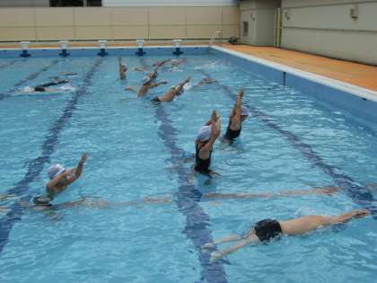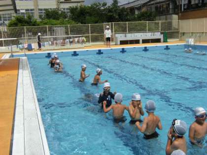 2年生は,伏し浮きの練習をがんばりました。朝に雨が降っていましたが,活動が始まると,おひさまも出てきました。伏し浮きの前に手を上にしっかりと伸ばし,頭を腕の前に出すことがきれいに伏し浮きができるコツです。