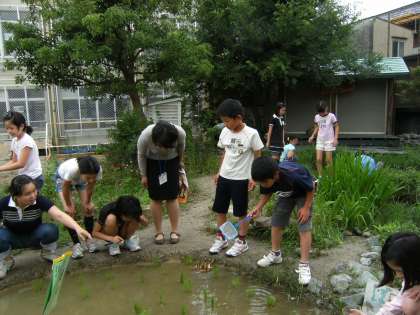 今日は,5年生の学習に理科支援員の宮津先生に入ってもらいました。ビオトープと田んぼの中の水中にいる生き物について一緒に学習しました。今後もよろしくお願いします。