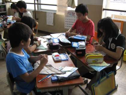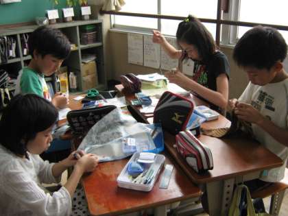 家庭科の学習で、家から持ってきたハンカチを使って「おはし入れ」を作りました。