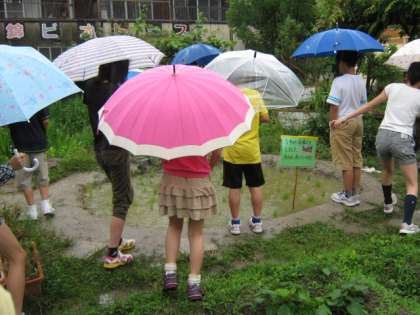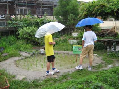 先週、田植えをした5年生の田んぼ。昨日、台風がきたことで「大丈夫かな・・・」みんなで、雨風の中様子を見にいきました。まだ、大丈夫!!